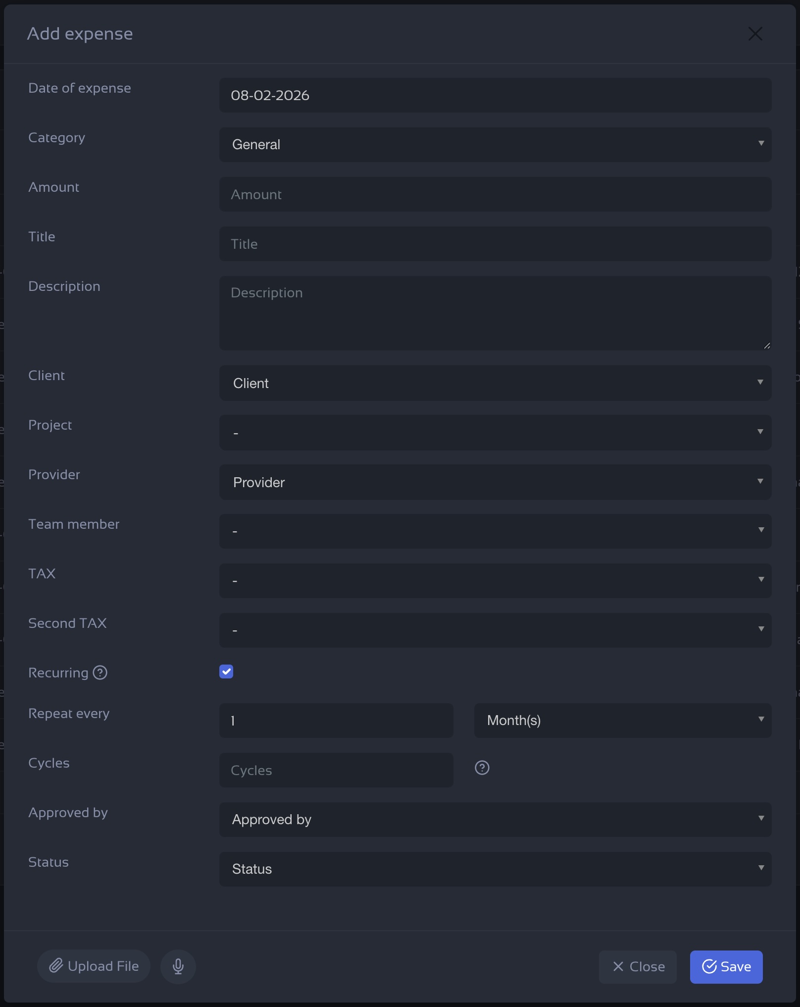 Recurring expenses are created automatically by the system. Make sure your categories and tax settings are correct before activating them to ensure accurate reporting.