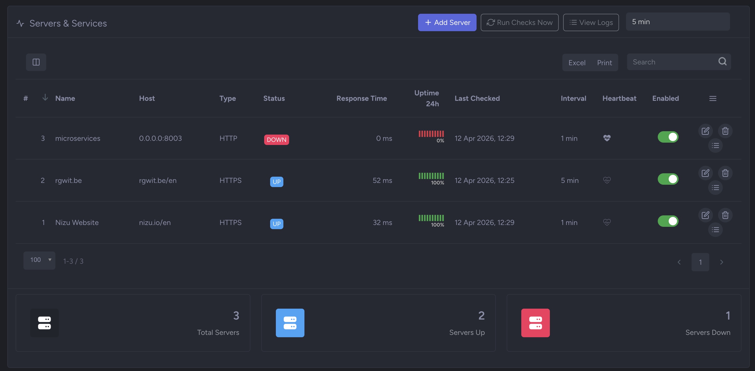 The dashboard shows a live summary: total servers, how many are up, and how many are down.