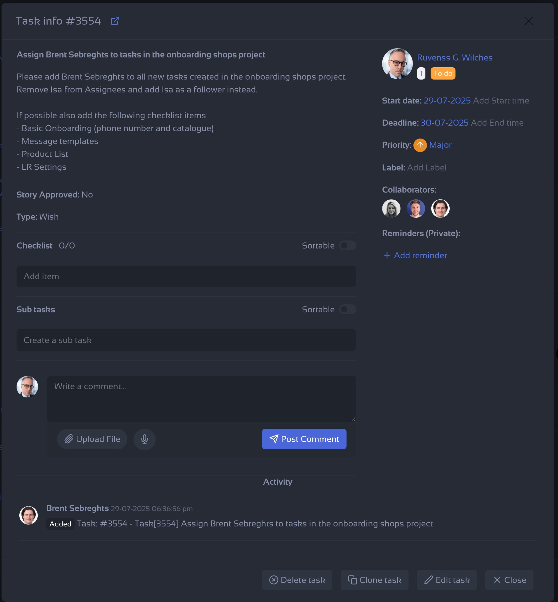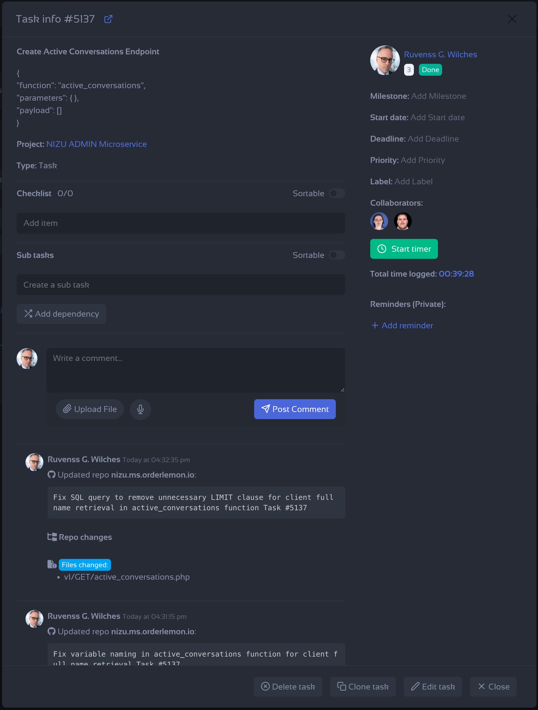 Example of a task inside a project: where the timer can be activated
